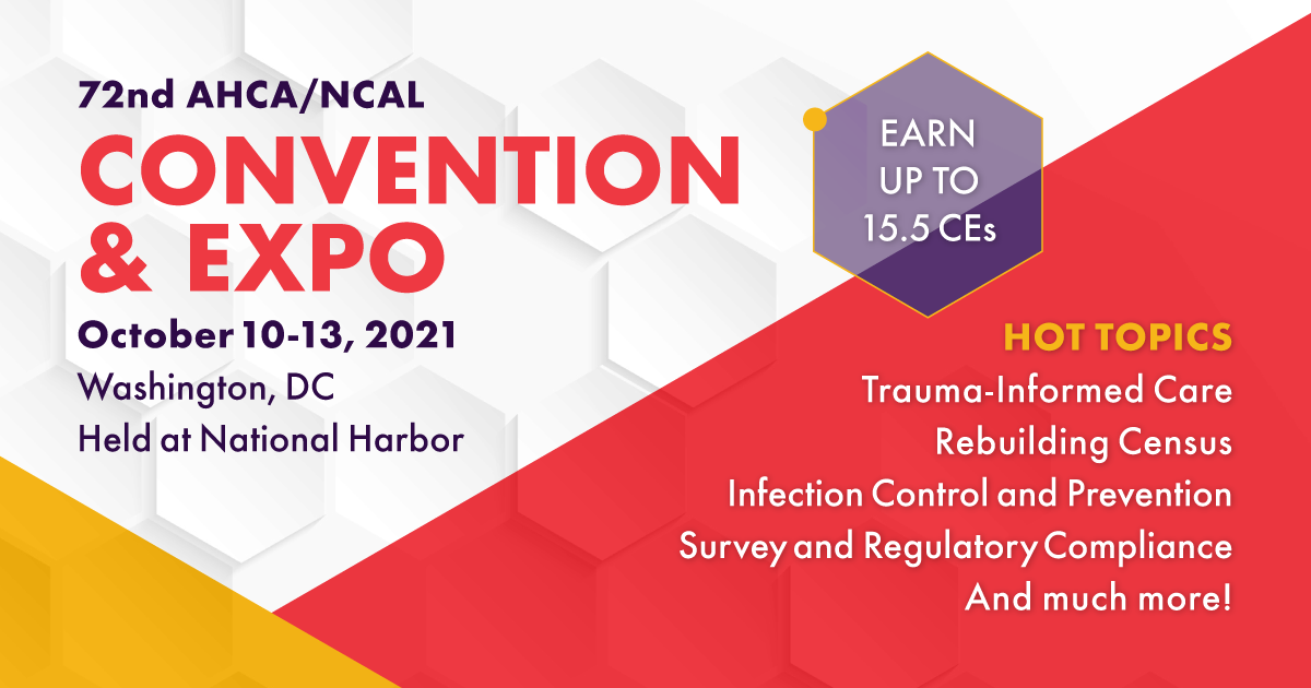 72nd AHCA/NCAL Convention & Expo with over 85 education sessions to choose from in 16 tracks of learning. You can earn up to 15.5 CEs. Hot topics include trauma-informed care, rebuilding census, infection control and prevention, workforce, reimbursement, and much more.